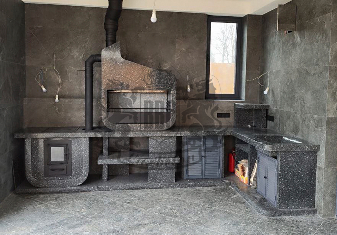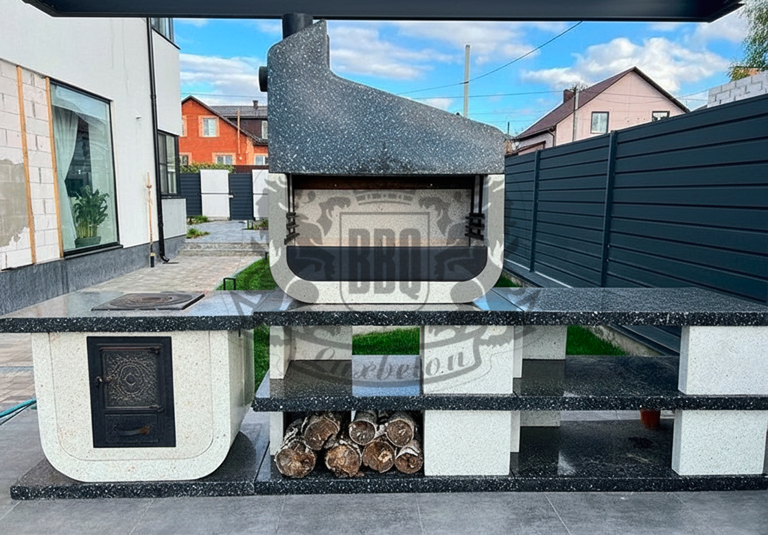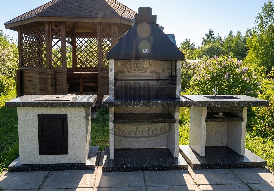 Дымосборник из металла 2 мм с жаропрочной краской, столешница не впитывает загрязнения и жир. Возможна установка дополнительных модулей: коптильня, тандыр, гриль для шампуров. Вес модулей 70–100 кг обеспечивает устойчивость. Монтаж проводится на ровную площадку — достаточно двух человек и пары часов времени.